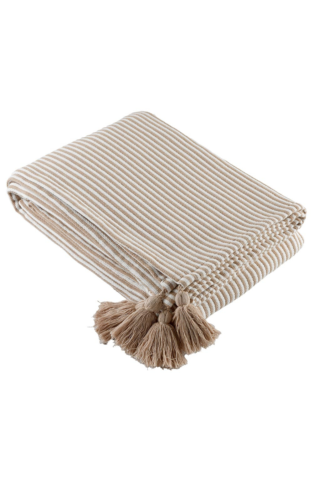 Plaid rayé au look naturel, qui rappelle la décoration des villas greques. Avec des coloris estivaux, et une fintion fantaisie "Pompon" inspiré des foutas de plage, il apportera un esprit détente et vacances à votre déco.