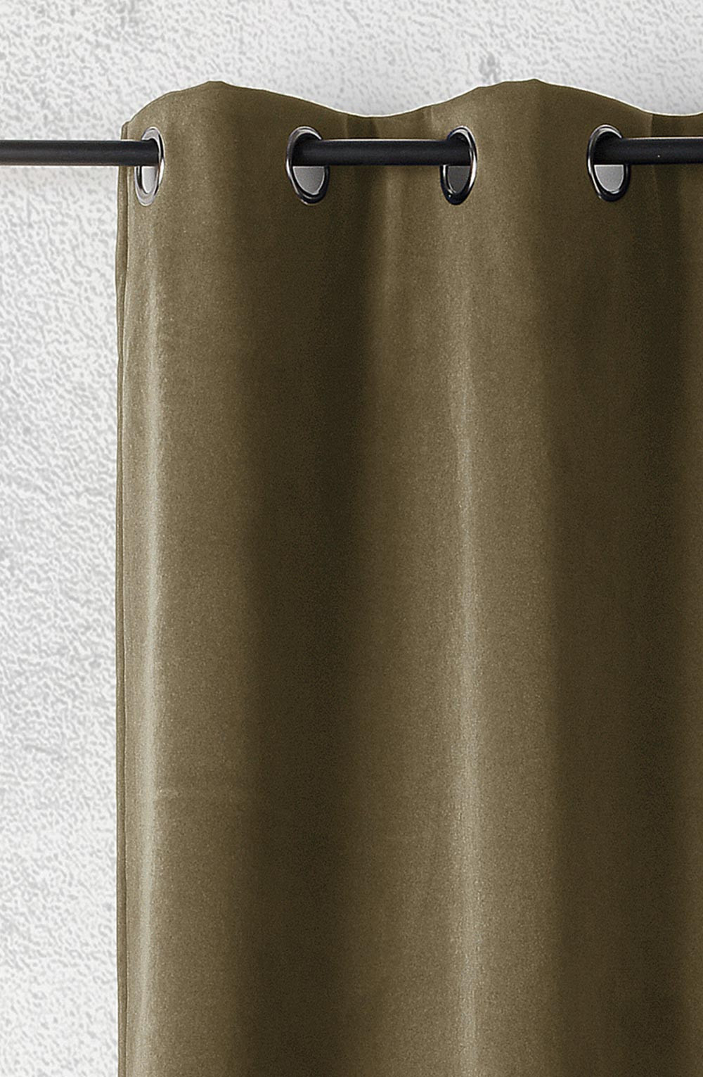 La finition du haut du rideau comprend 8 œillets ronds couleur canon de fusil de diamètre 40mm ainsi qu'une bande de renfort.